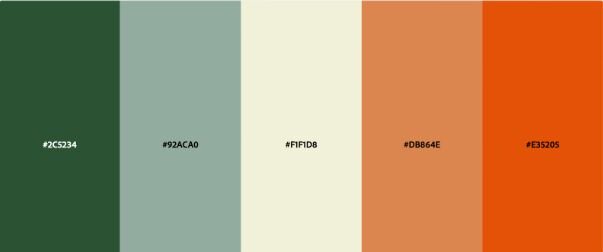 Source [ “#2C5234”, “#92ACA0”, “#F1F1D8”, “#DB864E”, “#E35205” ]