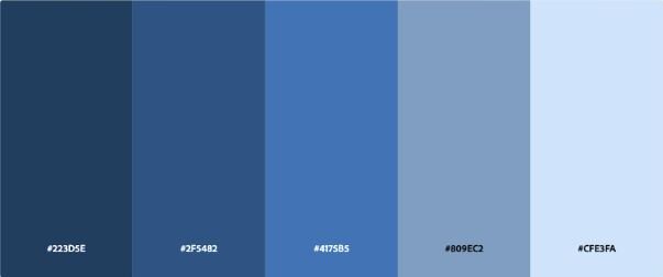 Source [ “#223D5E”, “#2F5482”, “#4175B5”, “#809EC2”, “#CFE3FA” ]