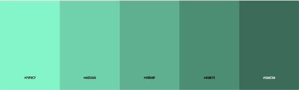 [ HEX codes: “#71F5C7”, “#61D2AA”, “#51B08F”, “#418E73”, “#326C58” ]