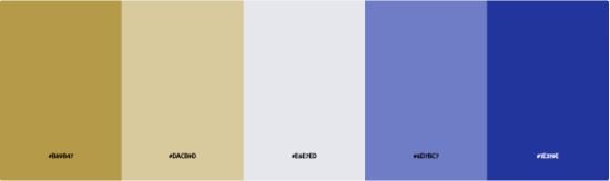 [ HEX codes: “#B89B47”, “#DACB9D”, “#E6E7ED”, “#6D7BC7”, “#1E319E” ]
