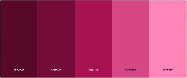 Source [ “#57092A”, “#750C39”, “#A81152”, “#D94886”, “#FF85BA” ]