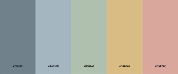 Source [ “#70818C”, “#A4B5BF”, “#B0BFAE”, “#D9BB84”, #D9A79C” ]
