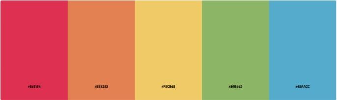 [ HEX codes: “#E63154”, “#EB8253”, “#F5CB65”, “#89B662”, “#45AACC” ]