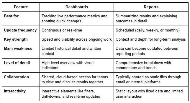 When I need a quick overview, I use dashboards. When I need to explain results, I turn to reports. Each tool gives a different layer of understanding. Here’s how they compare:
