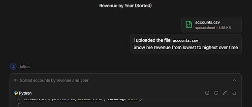 Tip: If your spreadsheet has multiple tabs, specify which one to use by saying something like "Use the Sales_Data tab only." This prevents Julius from pulling data from the wrong sheet.Step 2: Ask for a graph in natural language
