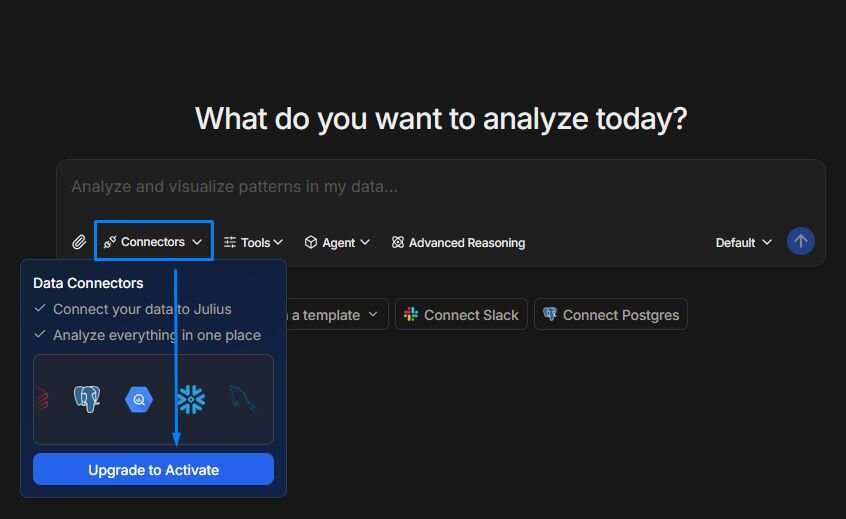 A Julius account: The free tier gives you 5 messages a month with the ability to upload files. To use connectors like PostgreSQL and BigQuery, you need to upgrade to a plan starting at $37/month, billed annually.