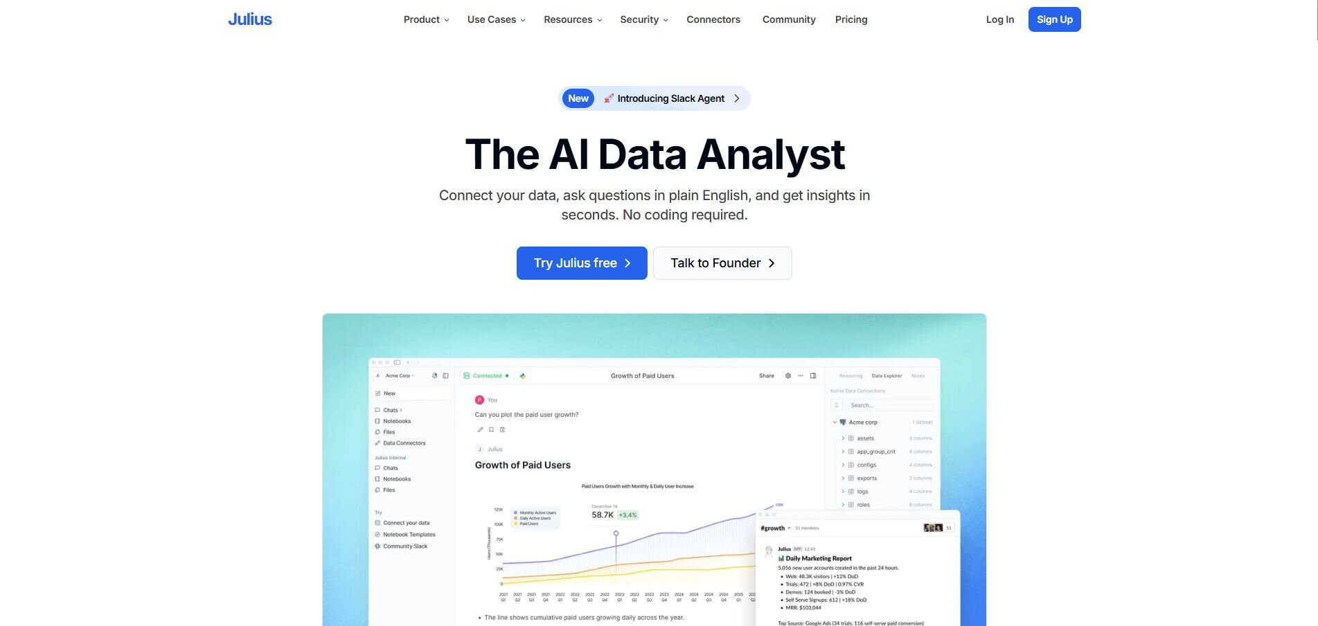 Julius connects directly to databases like Postgres, Snowflake, and BigQuery, so you don’t need to export files or request custom integrations just to run analysis. You can also upload CSV or Excel files when needed. Business users can ask questions in natural language and get charts, reports, and summaries based on the data your team already manages.